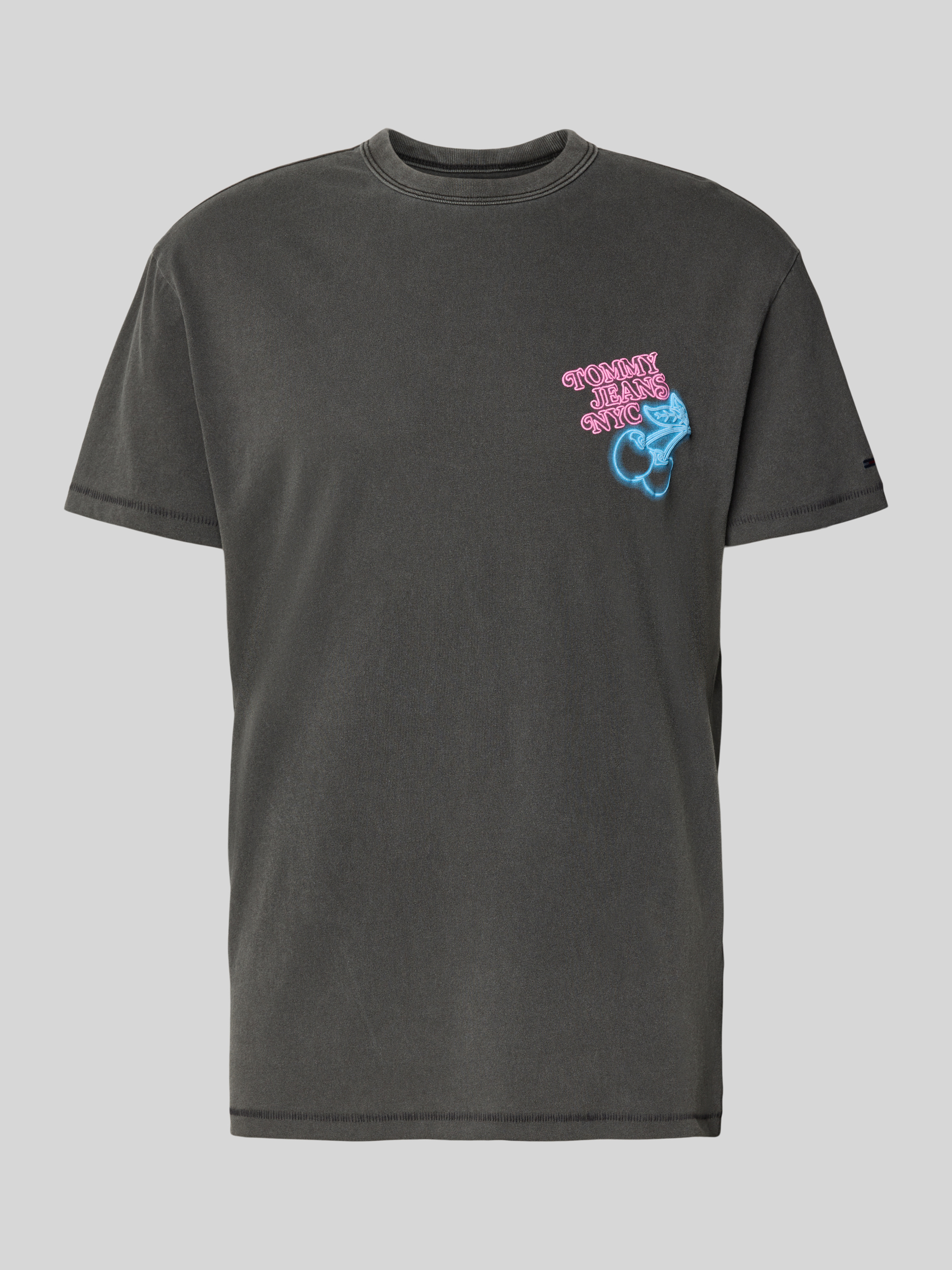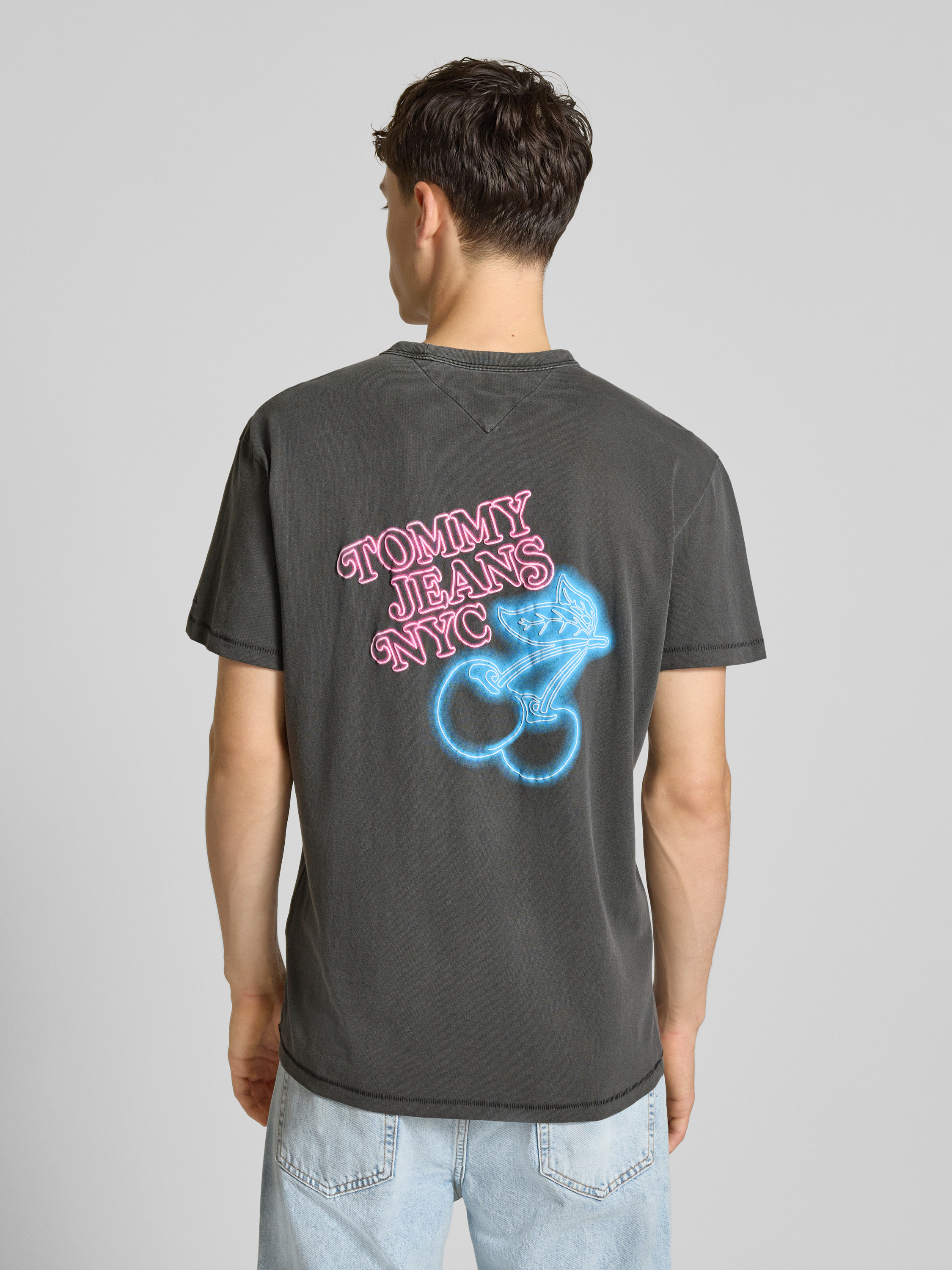 Das Herren T-Shirt von Tommy Jeans in Regular Fit kombiniert schlichte Eleganz mit hohem Tragekomfort. Gefertigt aus reiner Baumwolle, fühlt es sich angenehm auf der Haut an und eignet sich ideal für den Alltag. Der Rundhalsausschnitt und der dezente Motiv-Print runden das Design ab.
