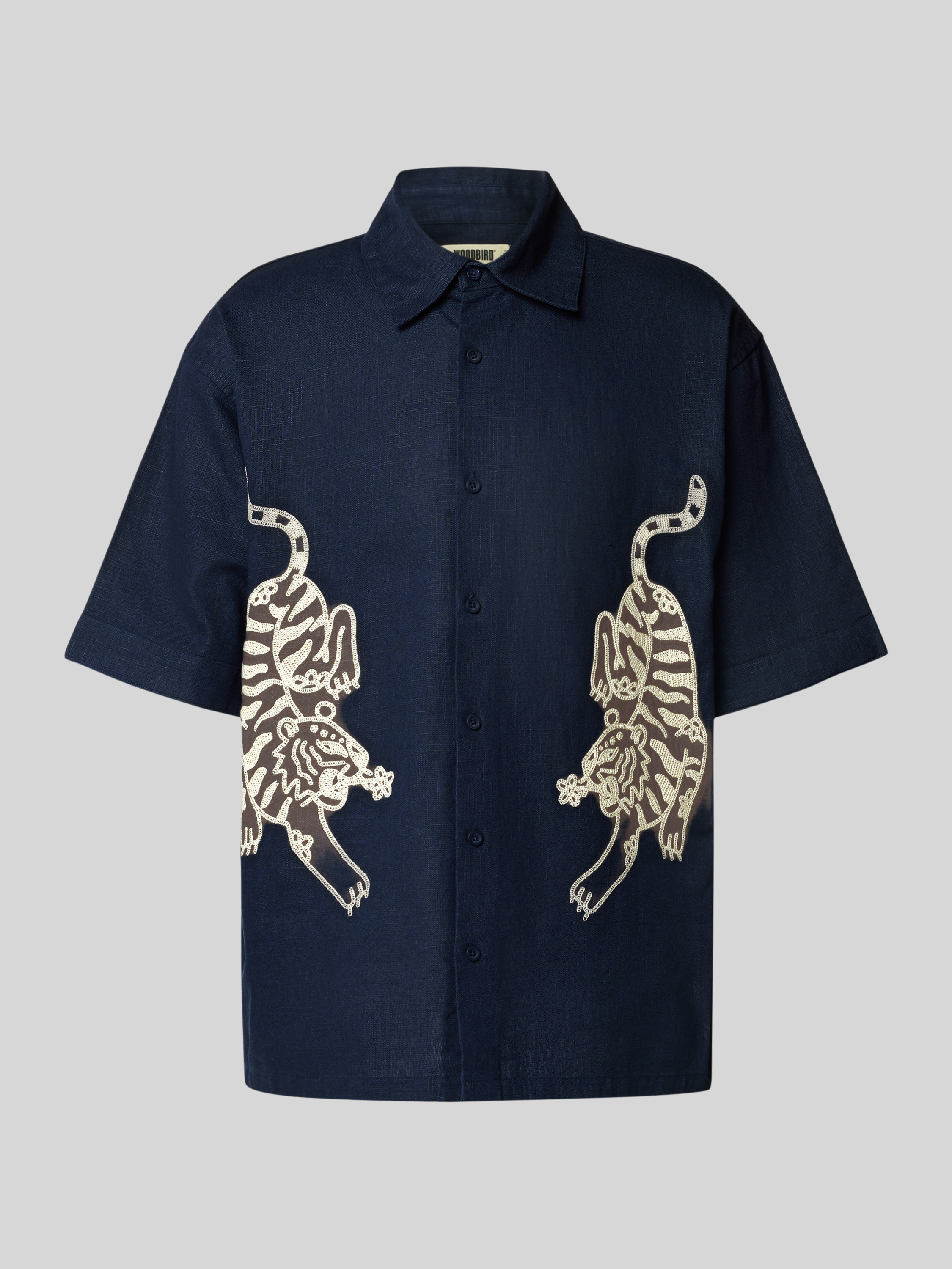 WOODBIRDRelaxed Fit Leinenhemd mit Motiv-Stitching Modell 'Wang' in marine
